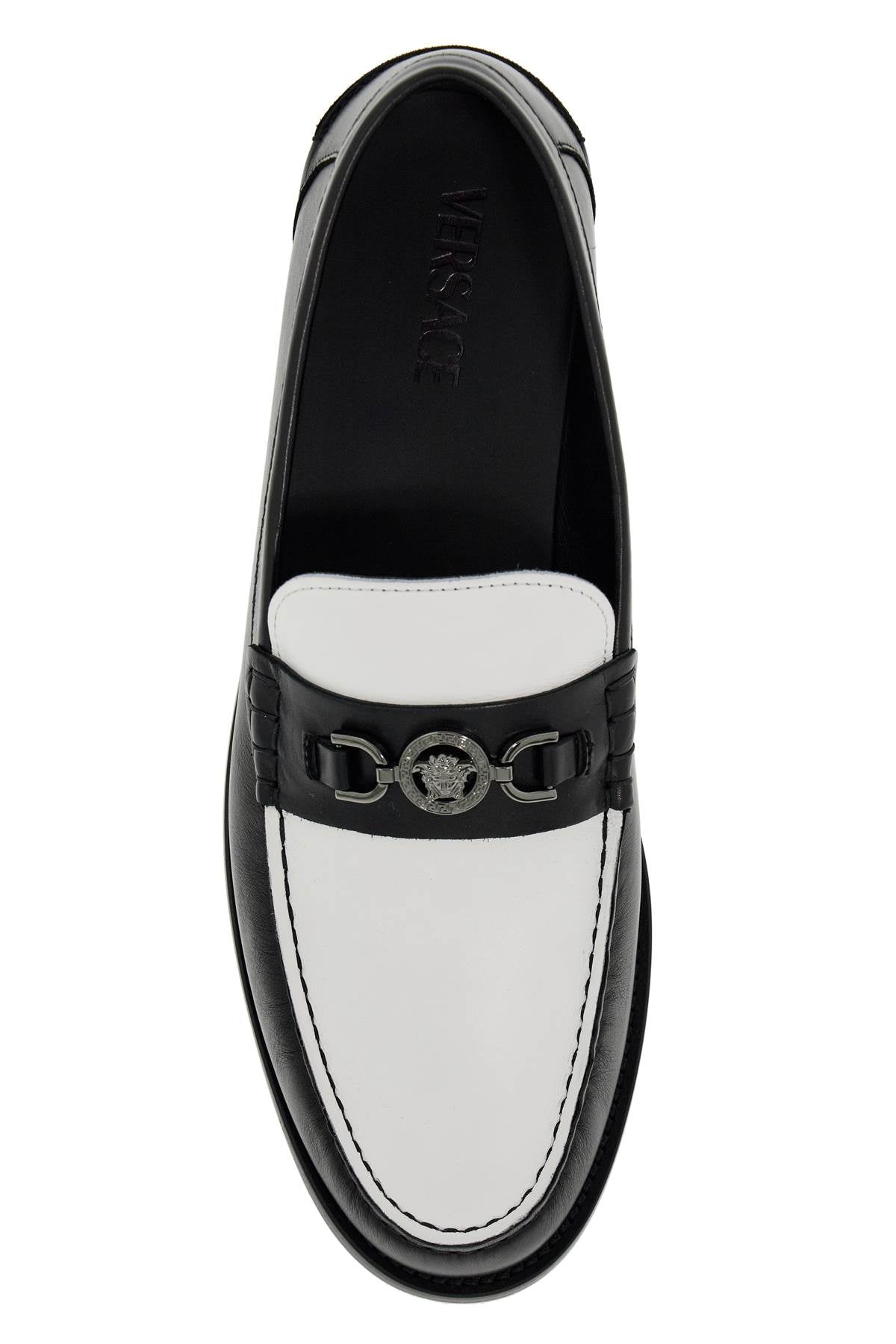 Versace loafers crafted in two-tone smooth leather and decorated with ruthenium-finished metal Medusa '95 on the penny bar. Leather interior and leather sole. Size and Fit - Heel Height = 2,5 cm,