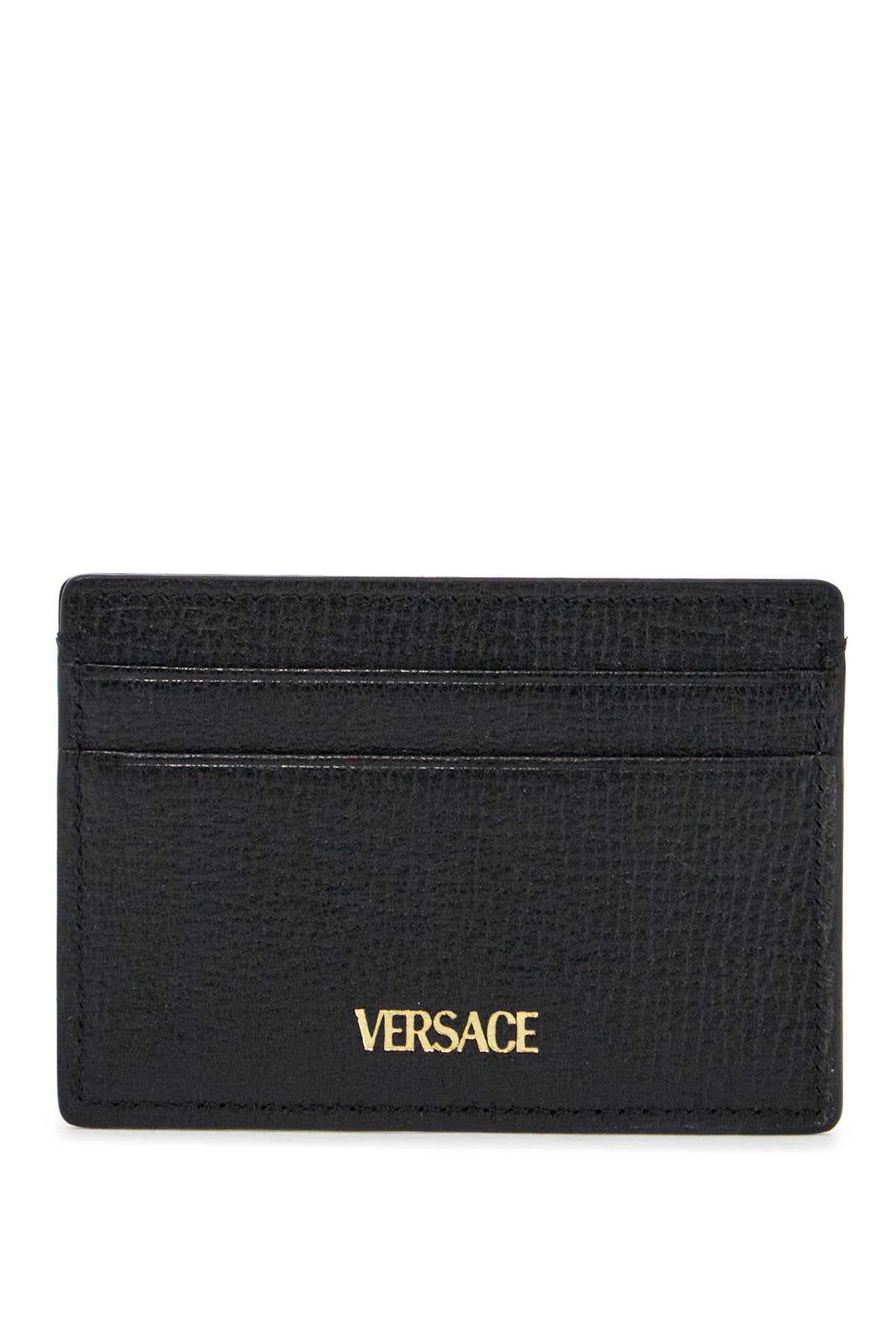 Versace card holder made of grained leather and embellished with the iconic Medusa Biggie emblem in golden metal. Four credit card slots and a central smooth leather slit pocket. Size and Fit - Accessory Length = 10 cm, Accessory Height = 7 cm,
