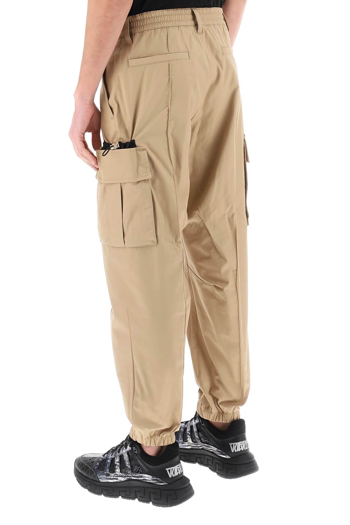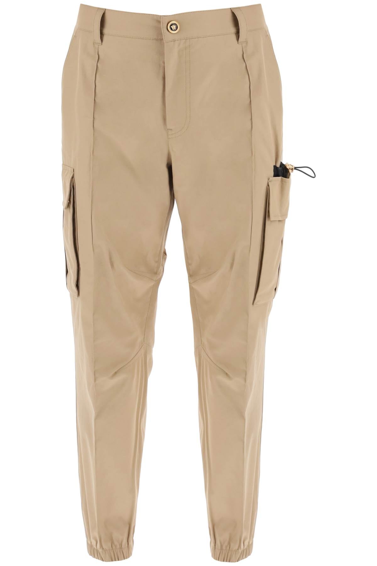 Versace cargo pants crafted in pure cotton twill with multipocket design enriched by gold-tone metal Medusa detailing. They feature front closure with zipper fly and button, belt loops, hem with elasticated cuffs, and it is styled with a contrast Barocco pocket on the leg. Loose fit with stitched crease. The model is 187 cm tall and wears size IT 48.
