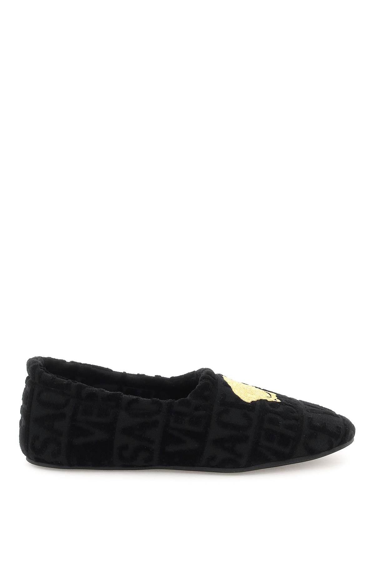 Cotton slipper by Versace with logo texture effect and iconic embroidered golden Medusa.