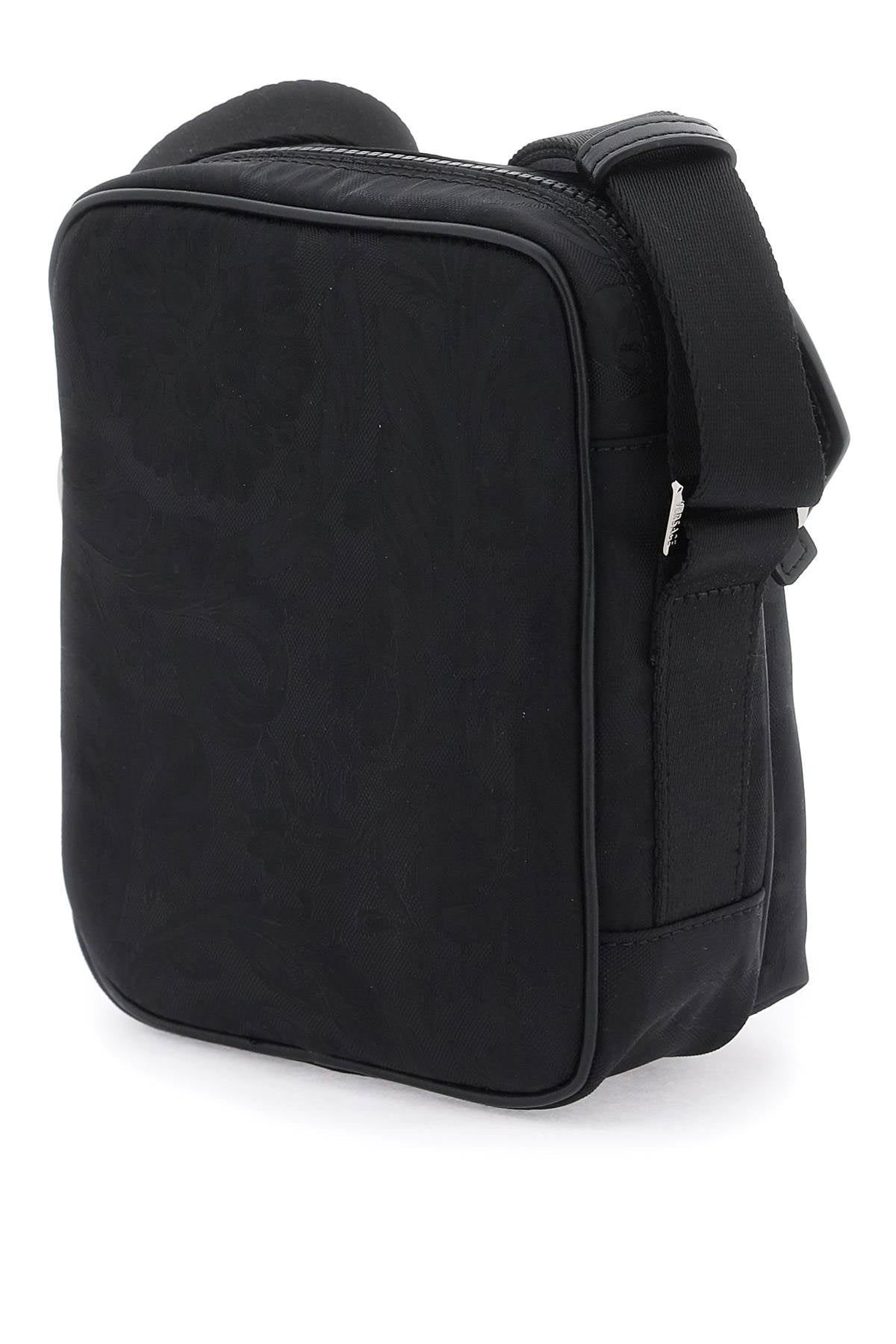 Versace crossbody bag made of ECONYL® regenerated nylon with Barocco Silhoutte pattern in tone-on-tone jacquard. It features front flap personalized with Greca buckle with concealed flat pocket, zippered main compartment with nylon lining. Adjustable fabric shoulder strap, metal hardware with silver finish. Size and Fit - Bag Length = 17 cm, Bag Height = 20 cm, Bag Weight = 11,5 cm, Shoulder Bag Length = 128 cm,