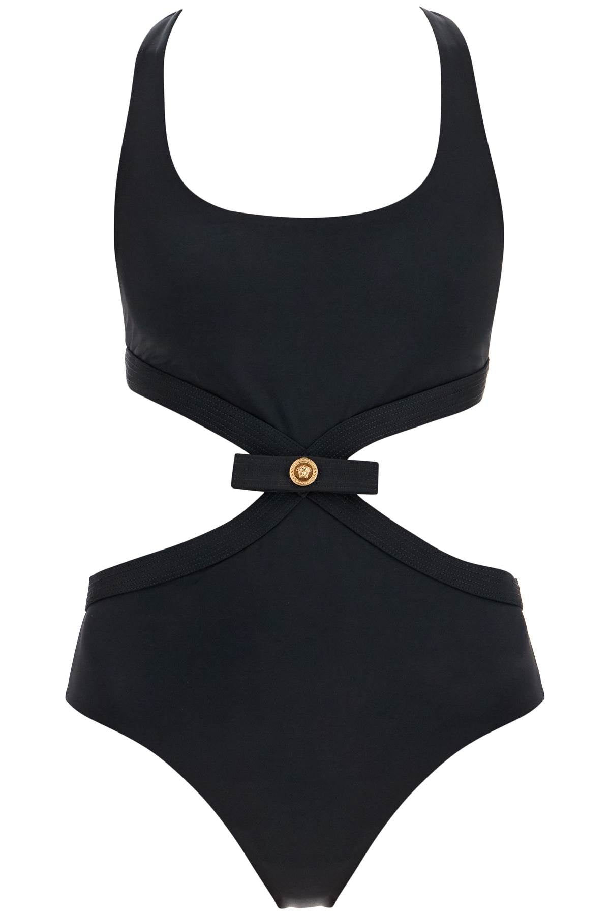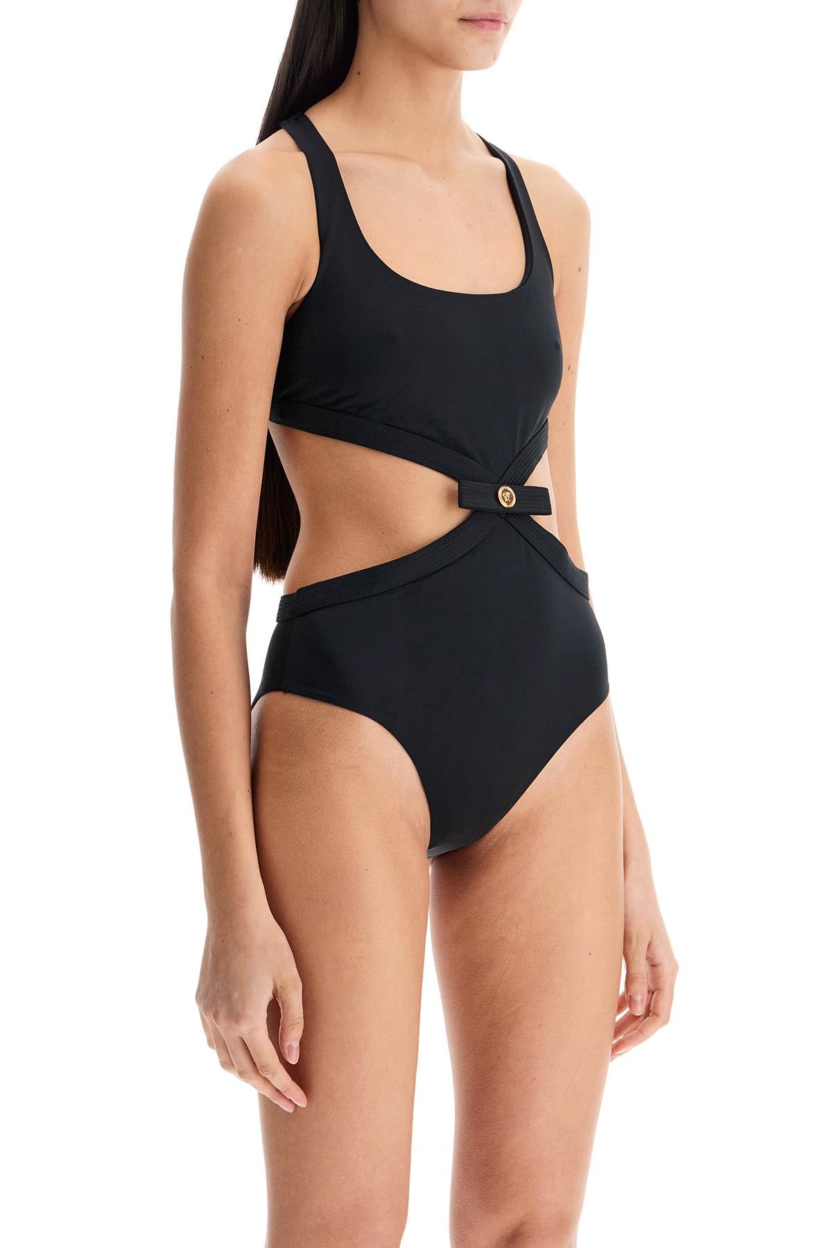 This Versace one-piece swimsuit is made of lycra and decorated with the iconic 'Gianni ribbon', complete with a golden Medusa appliqué on the front. It features a cut-out design with a deep neckline at the front and a racerback style at the back. The high-cut bottom is lined for comfort. The model is 177 cm tall and wears an IT size 2.