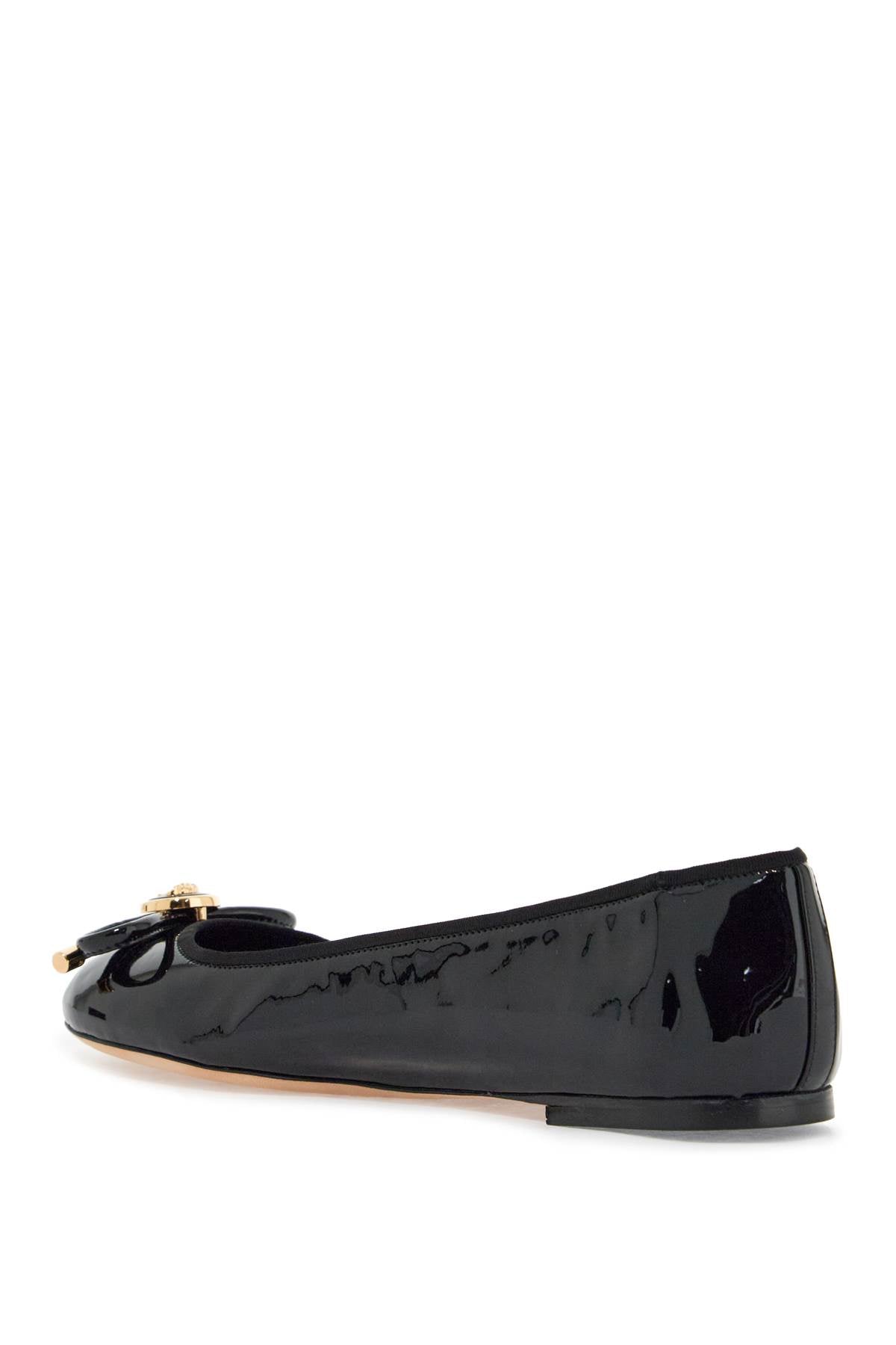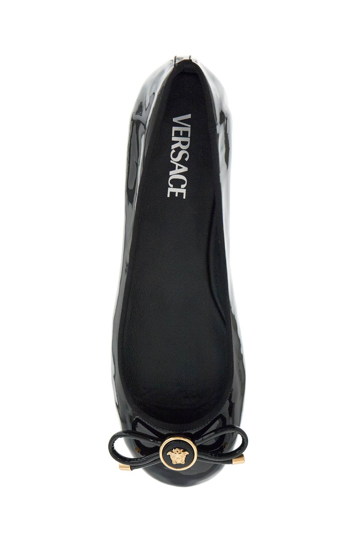 Versace ballerinas made of patent leather and decorated with a bow and Medusa detailing on the toe. Leather insole and leather sole.