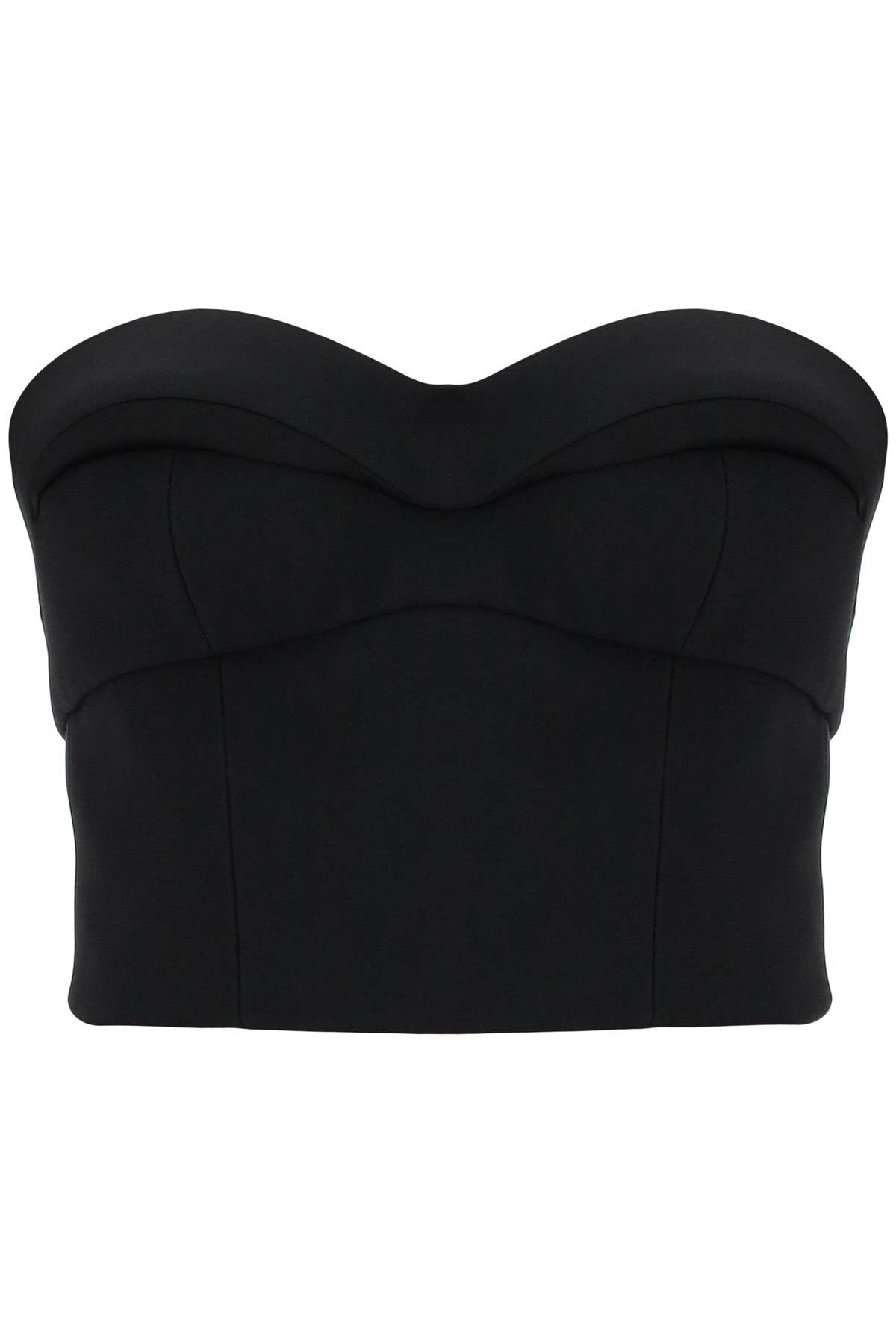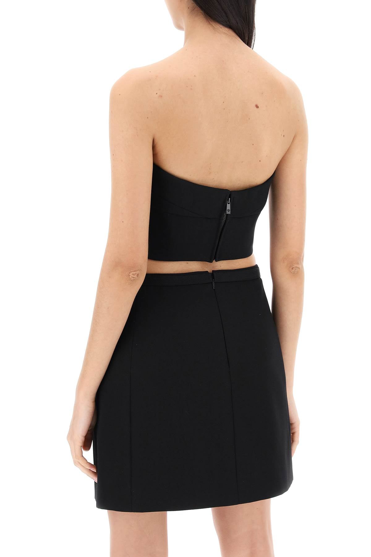 This Versace crop top bustier is made of double-layered viscose blend crepe, featuring a sweetheart neckline with molded cups enriched by a padded three-dimensional insert. It has an internal underwire and a visible zip closure on the back. Lined. The model is 177 cm tall and wears an IT size 40.