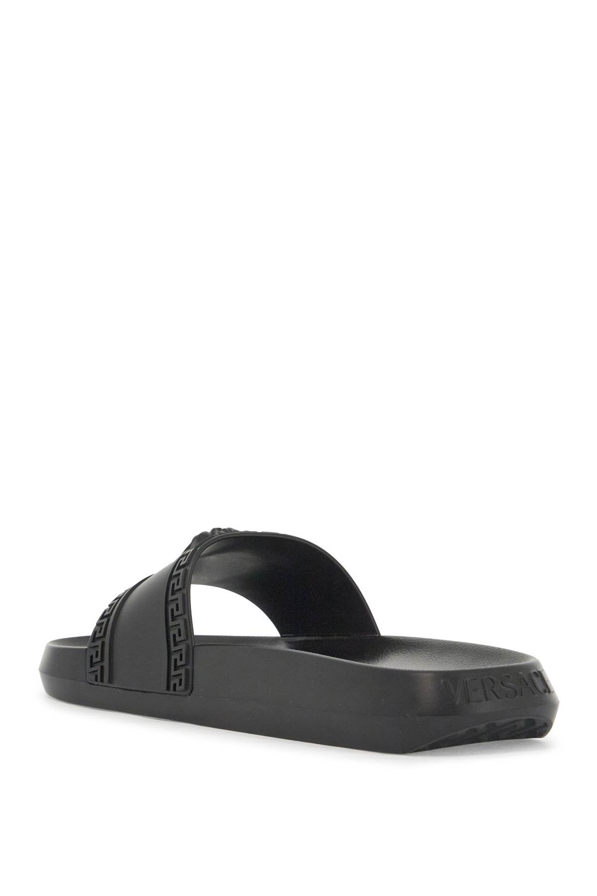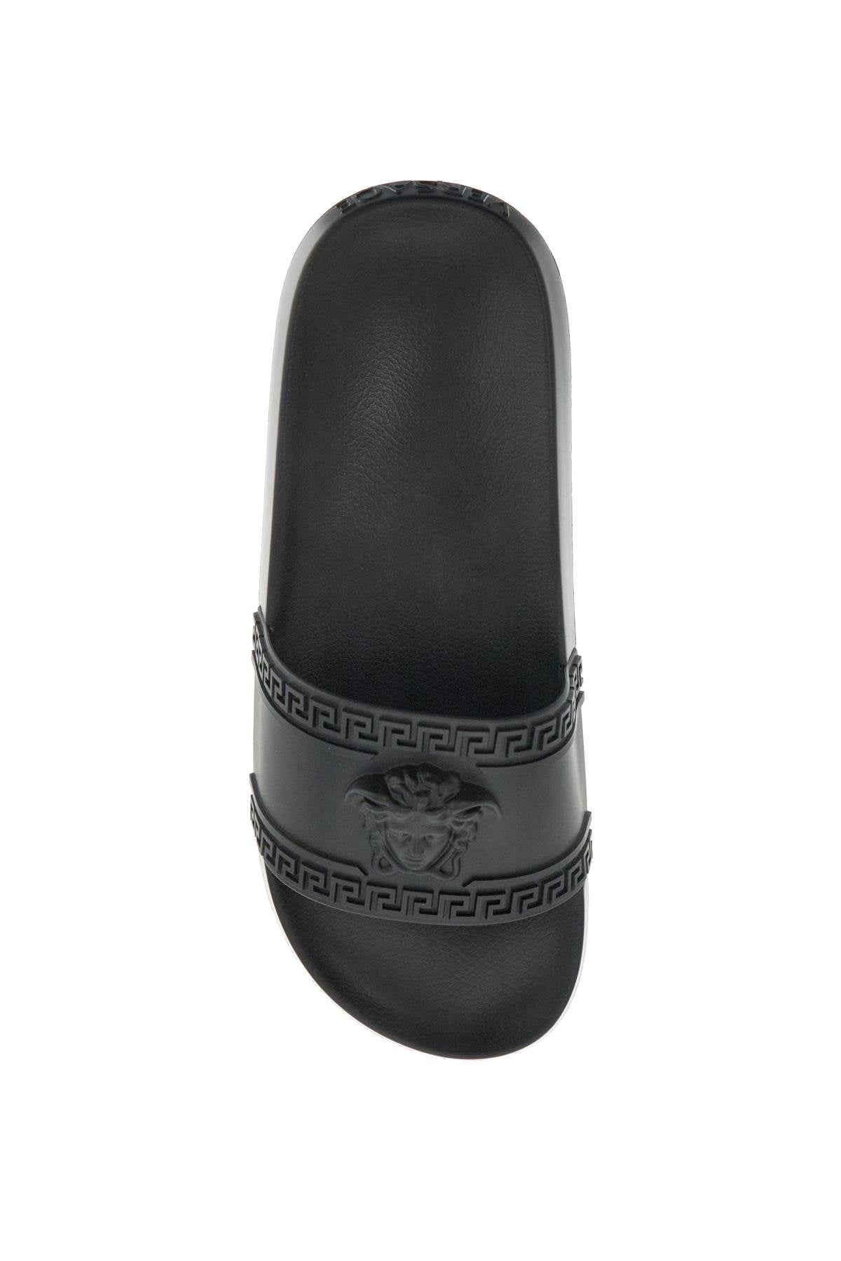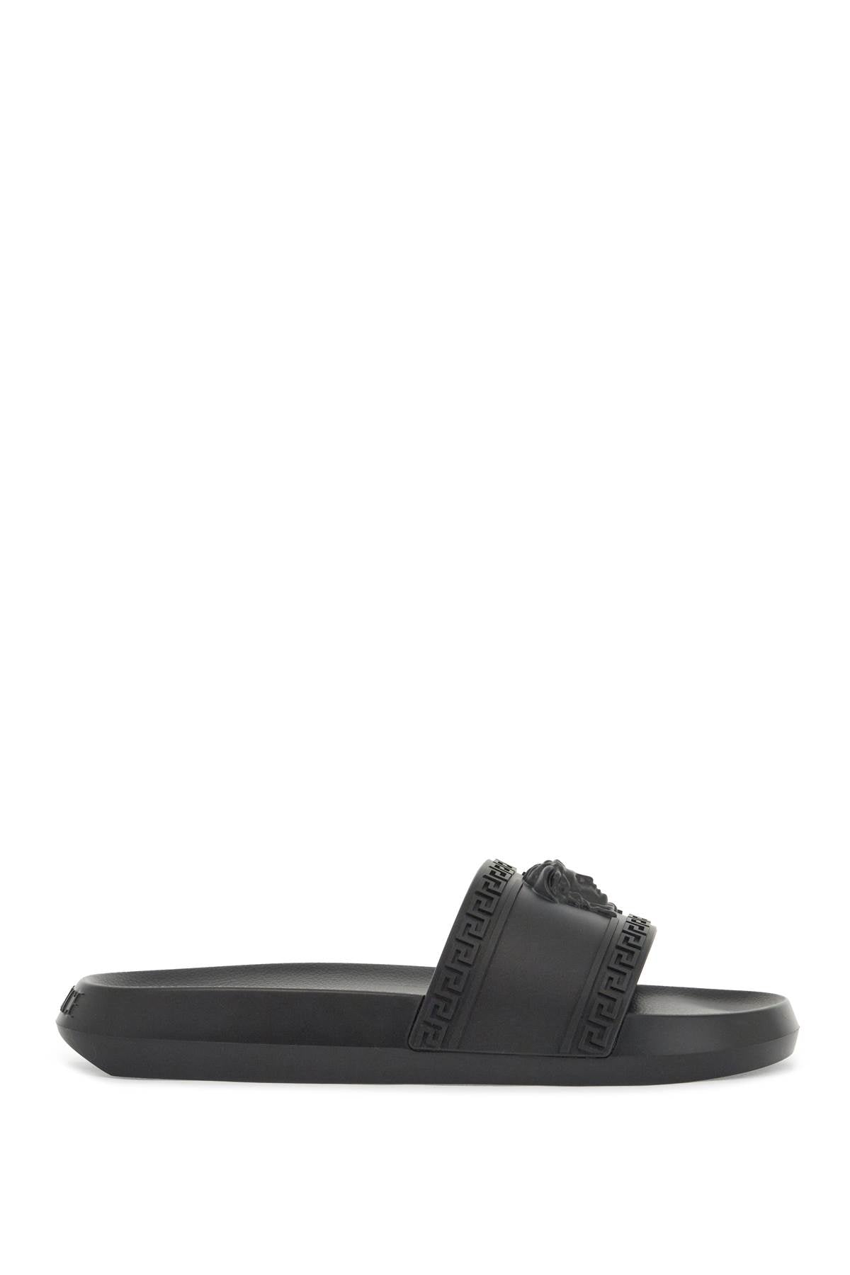 Palazzo slides by Versace entirely crafted in rubber with embossed Greca motif and iconic three-dimensional Medusa head on the band. Embossed lettering logo on the back. Moulded footbed. Size and Fit - Heel Height = 3 cm,