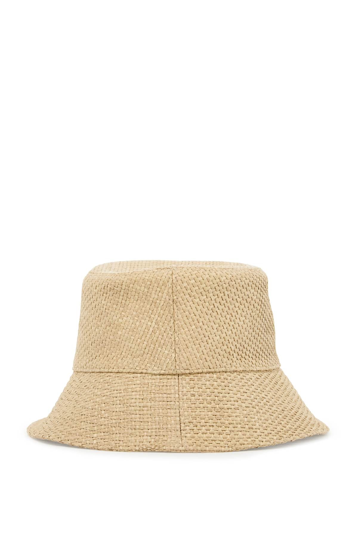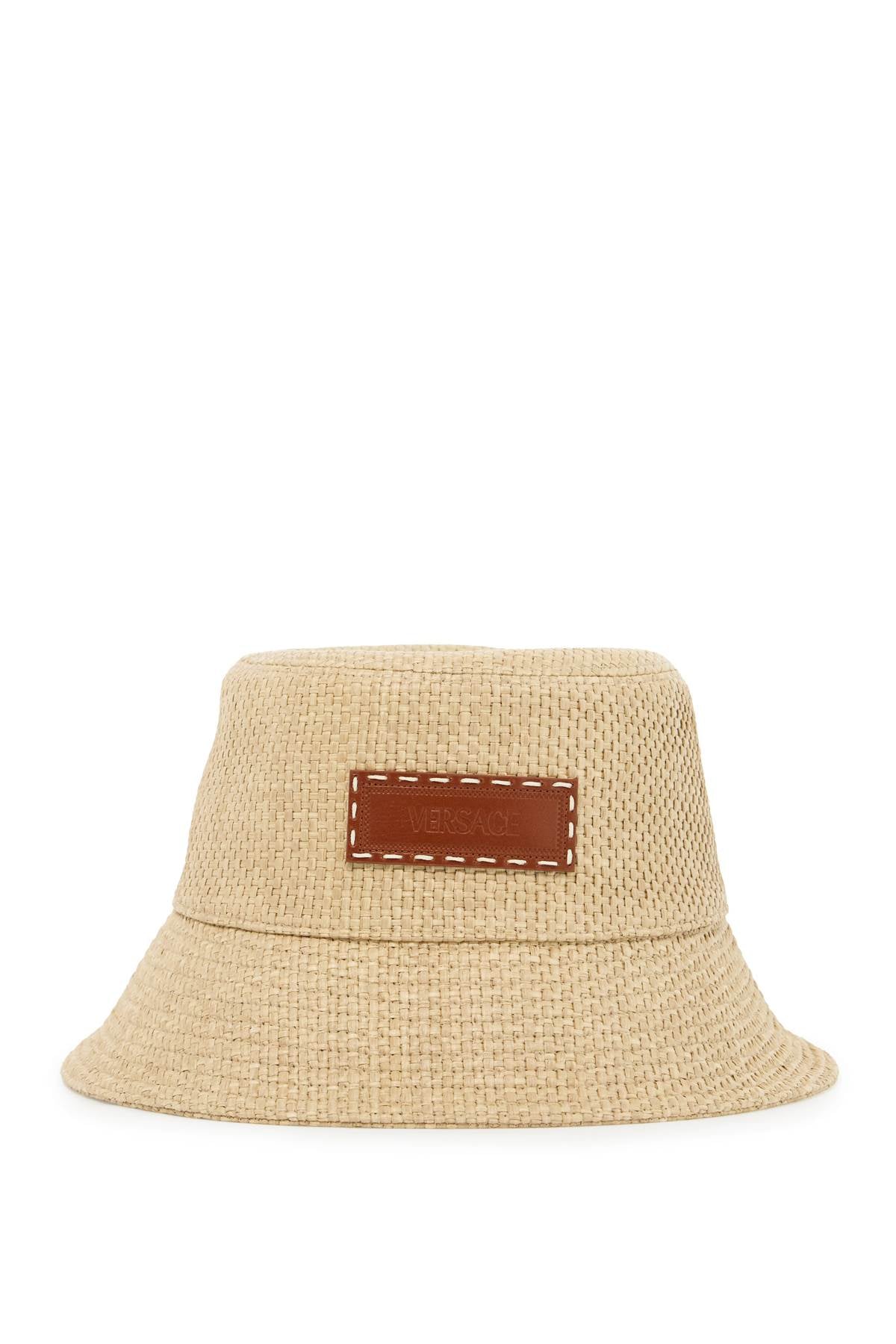 This Versace bucket hat is made of woven raffia with a leather logo patch applied on the front. The interior is lined with cotton. The item in the photo corresponds to size 58.