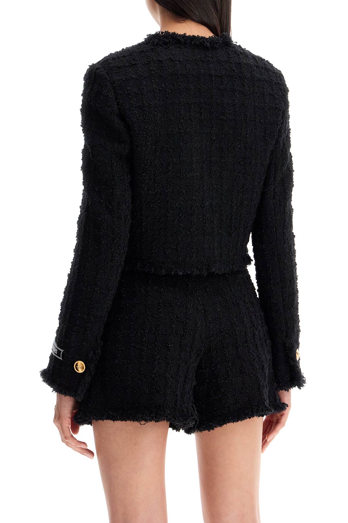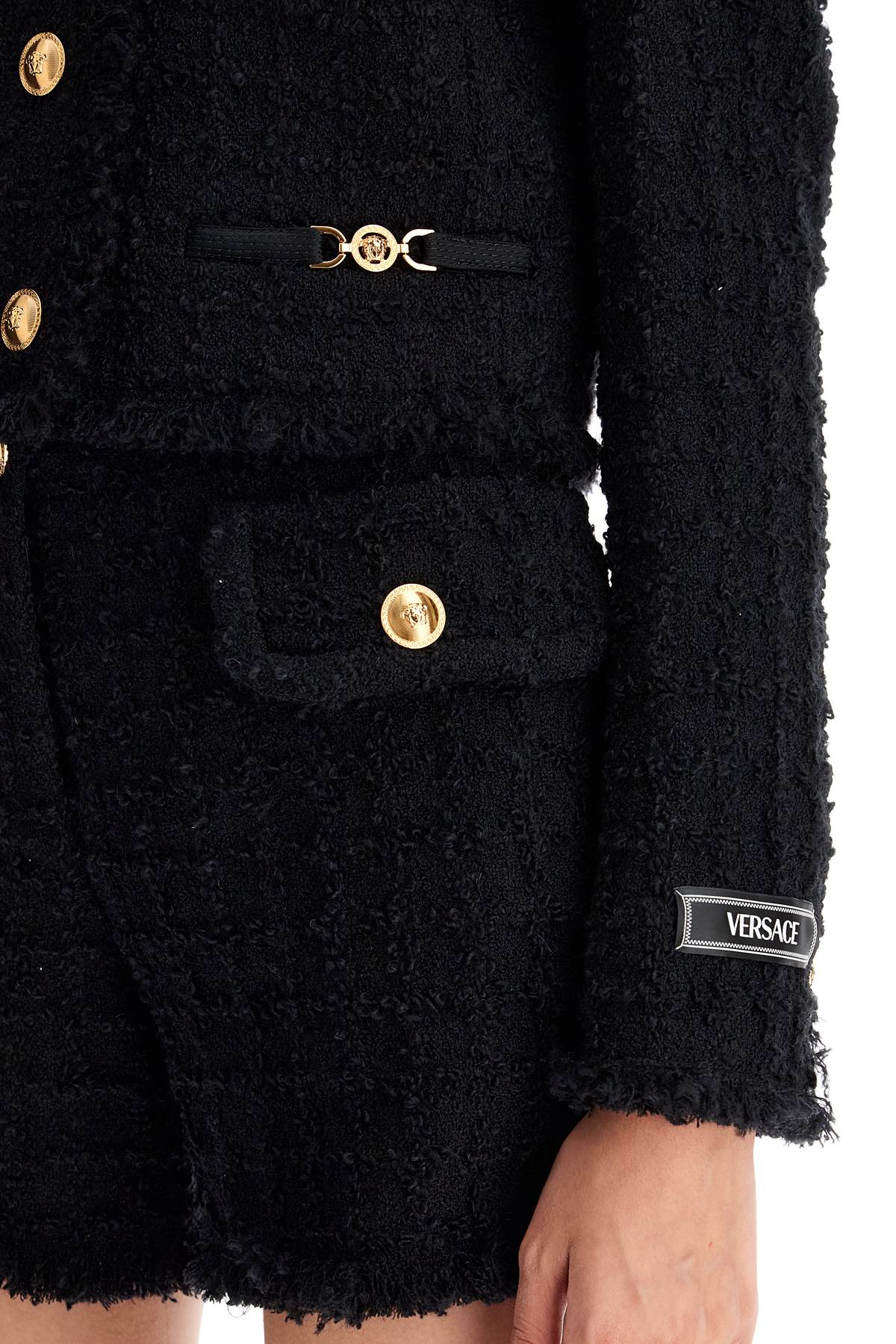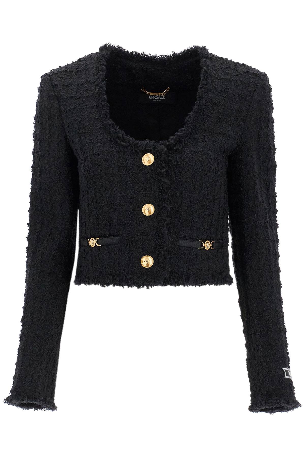 This short Versace jacket is made of wool and mohair tweed bouclé, with a U-neckline and embellished with golden Medusa buttons and '95 Medusa applications. The interior is lined. The model is 177 cm tall and wears an Italian size 40.