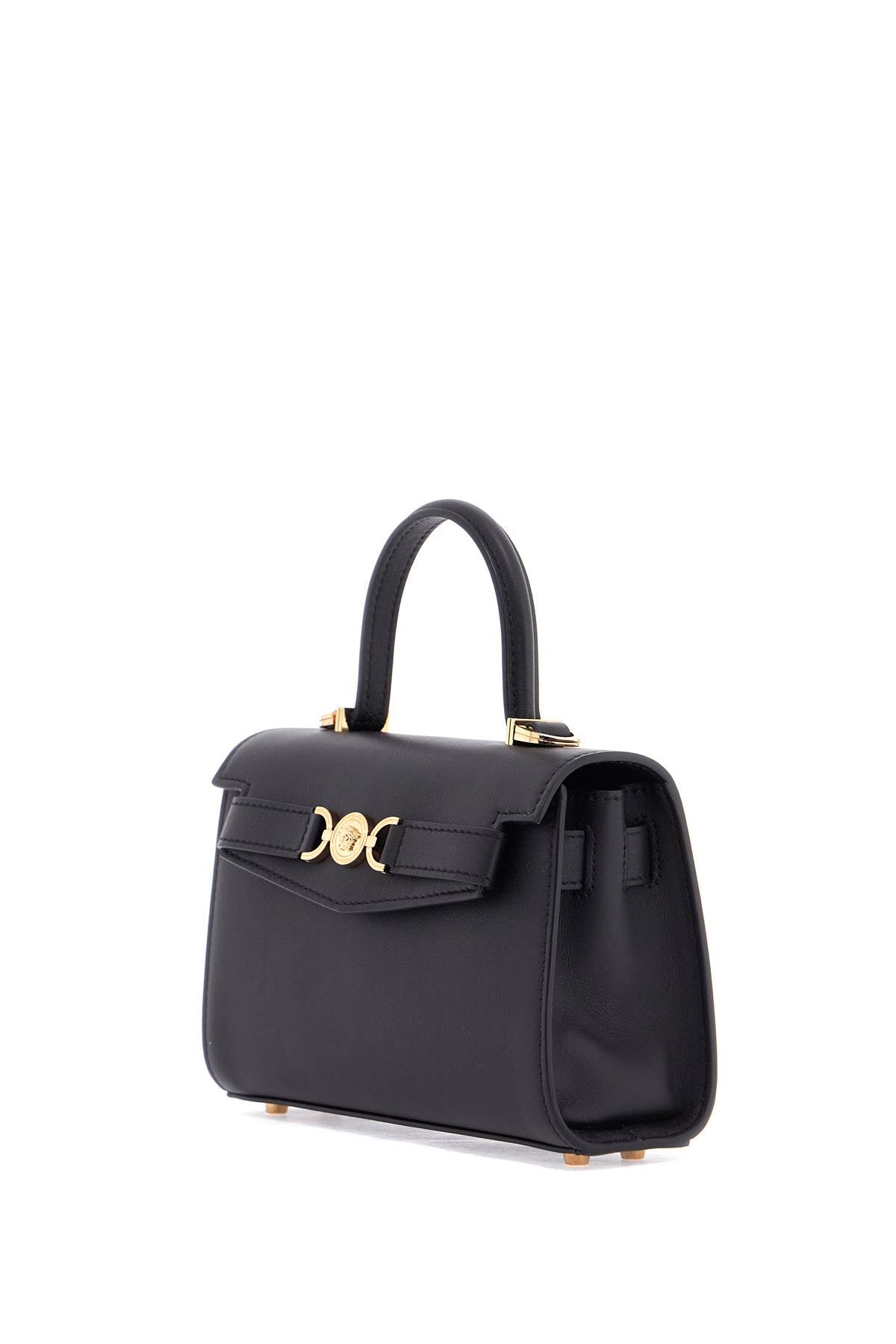 This small Versace handbag is made of smooth flat-grain leather and features a strap embellished with the iconic Medusa '95 customization. It has a magnetic flap closure, a nappa-lined interior with two open pockets, expandable sides with cinch straps, and metallic feet at the base. The design is versatile thanks to the single handle and additional adjustable shoulder strap. Metal accessories have a gold finish. Size and Fit - Bag Length = 21 cm, Bag Height = 15 cm, Bag Weight = 7,5 cm, Handle Height = 8,5 cm,