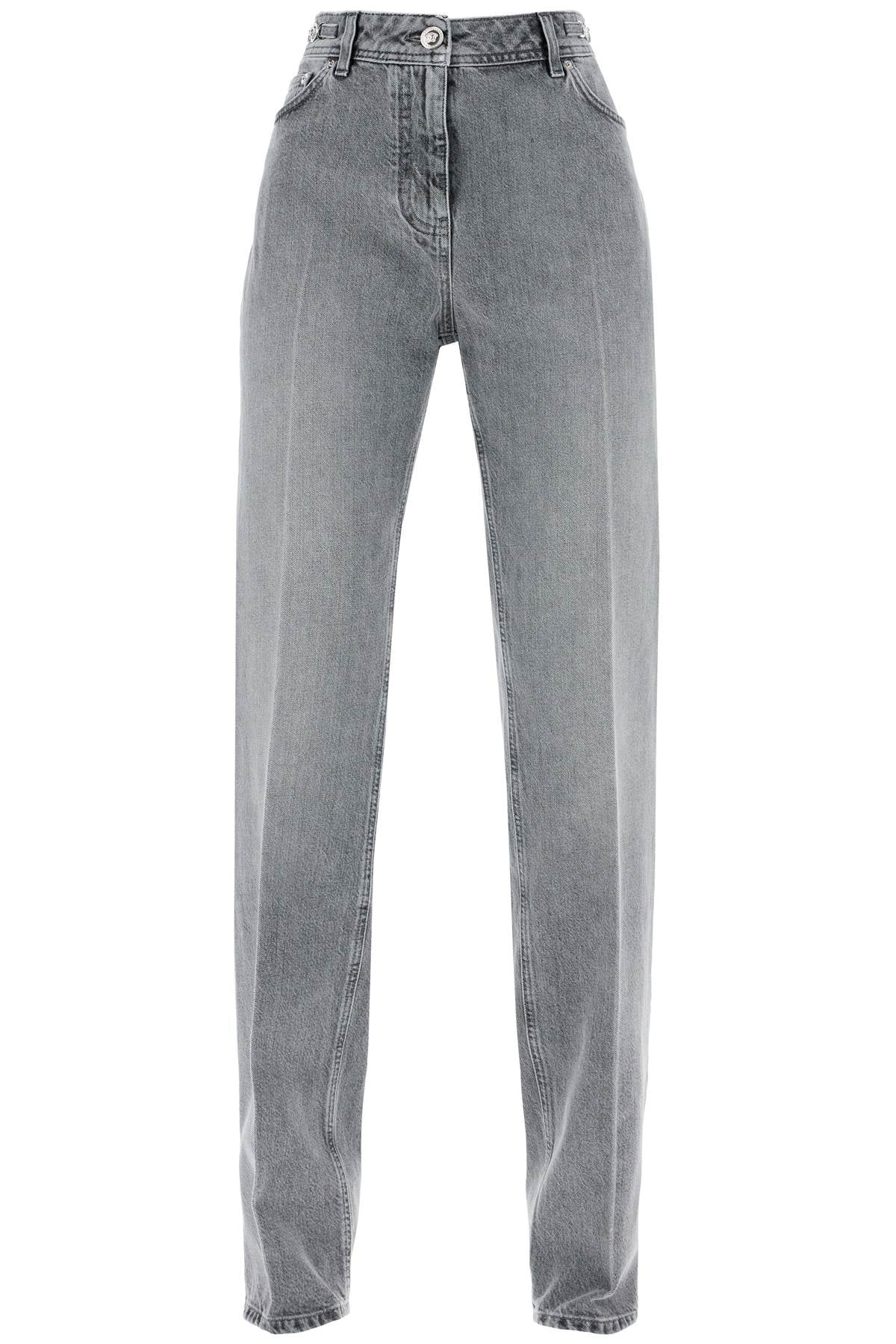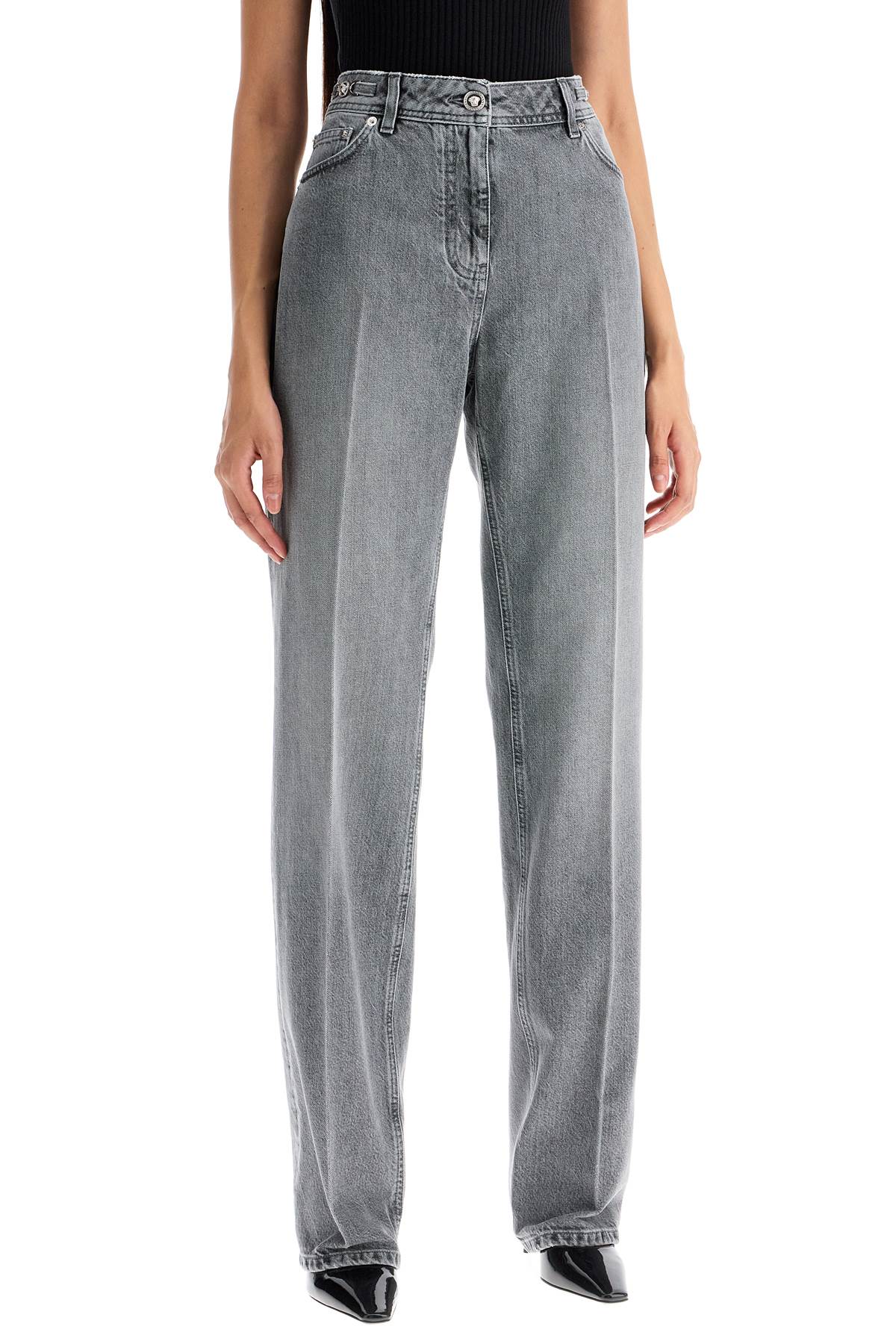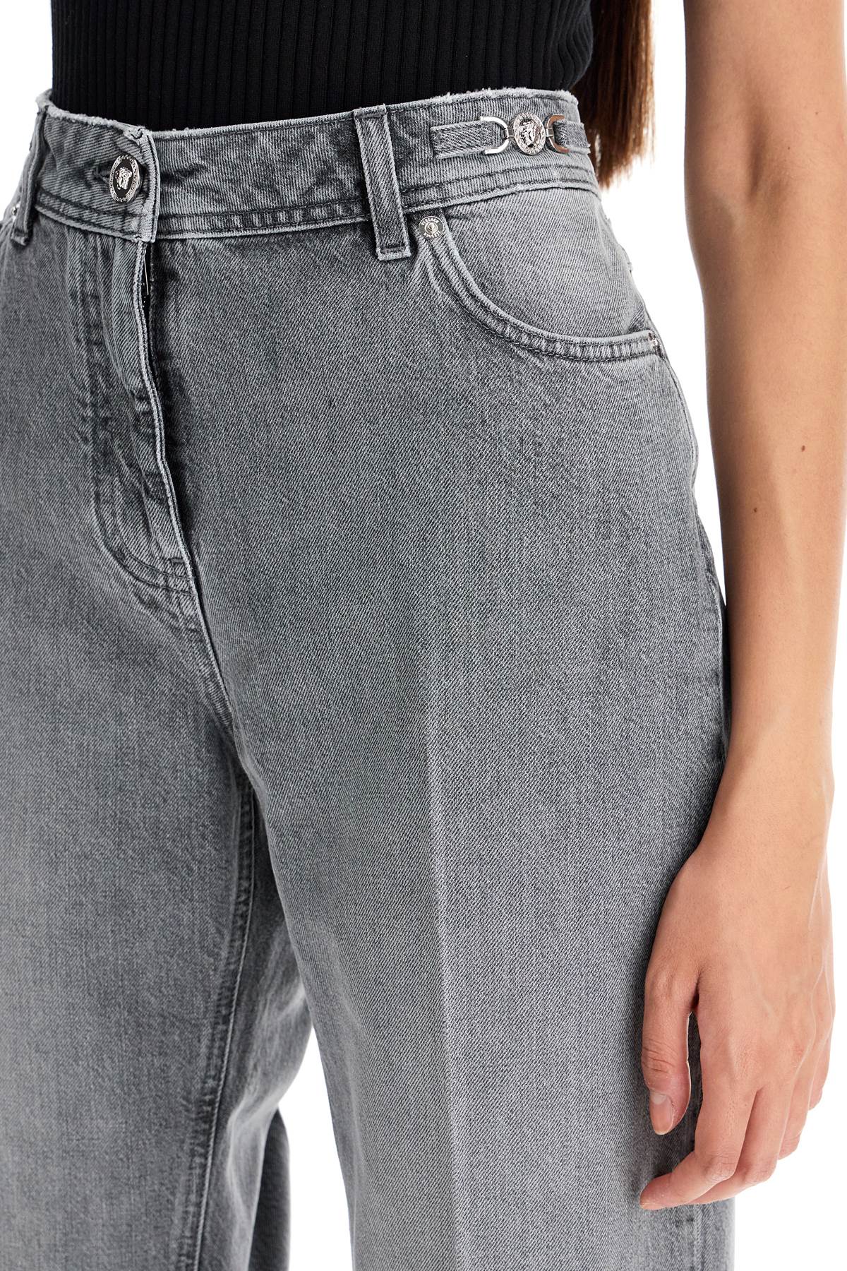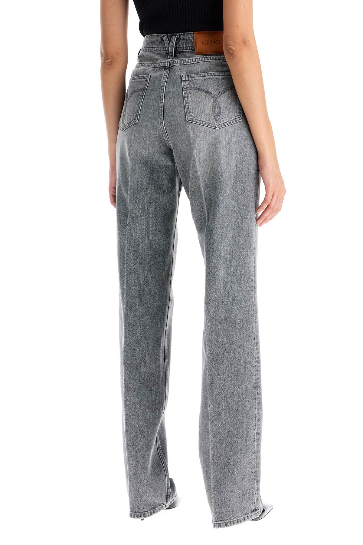 These Versace five-pocket jeans are made of grey stone wash denim and feature "Medusa '95" details on the waistband. The straight leg design has a regular fit, finished with pressed creases and belt loops. They fasten at the front with a Medusa button and zip closure. The model is 177 cm tall and wears a size 26.