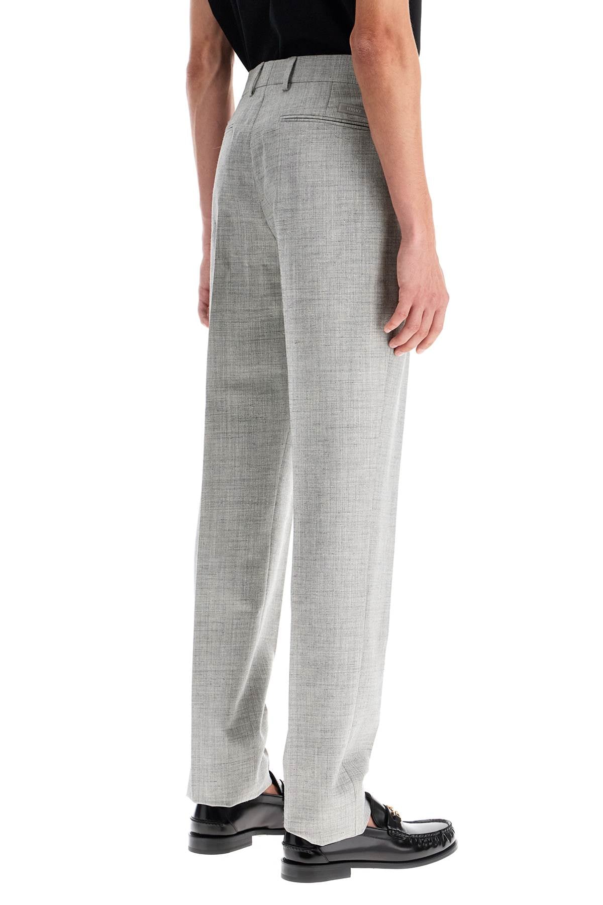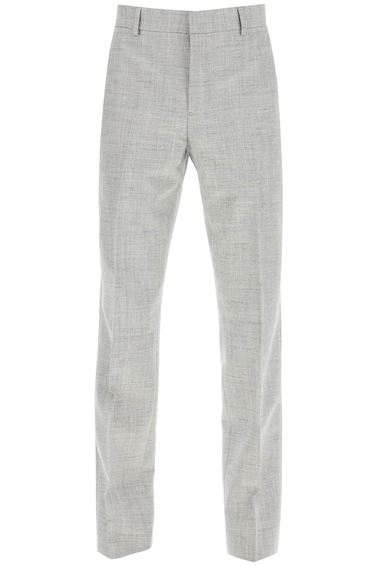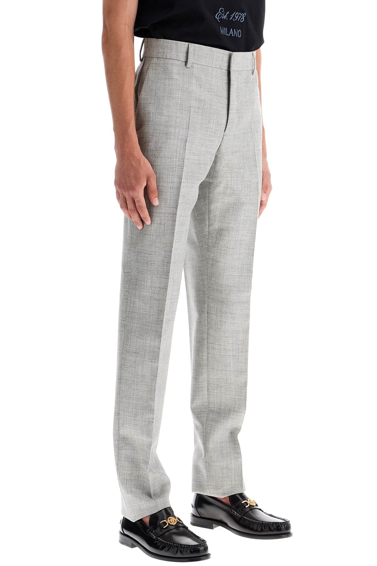 Tailoring pants by Versace crafted in pure virgin wool twill with cigarette cut enhanced by pressed crease. It features front fastening with zipper fly, hook and button, side slash pockets, back welt pockets and belt loops. Enriched by tailoring label on the back. They come unhemmed to allow further tailoring. The model is 187 cm tall and wears size IT 48.