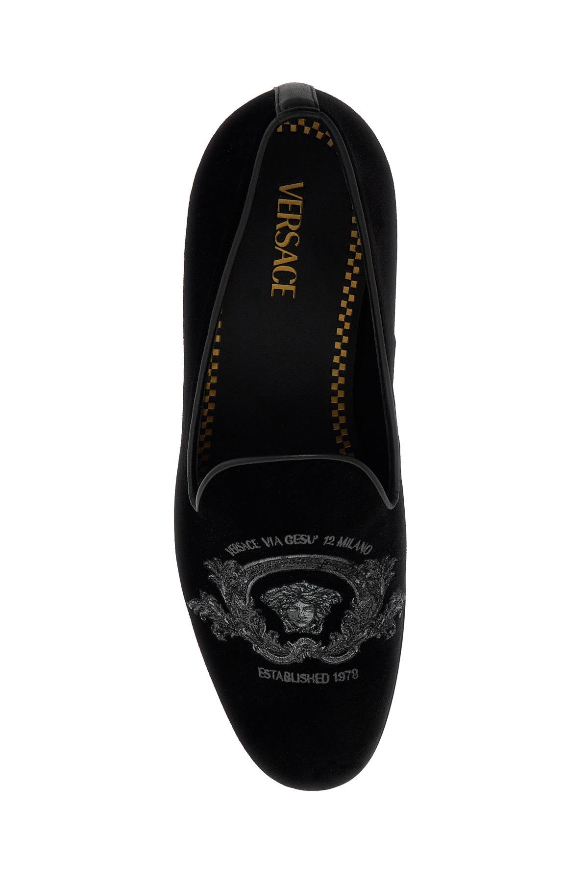 Versace velvet loafers featuring Medusa embroidery with the year of the Maison's foundation and the address of Palazzo Versace in Milan. Leather interior and leather sole. Size and Fit - Heel Height = 2 cm,